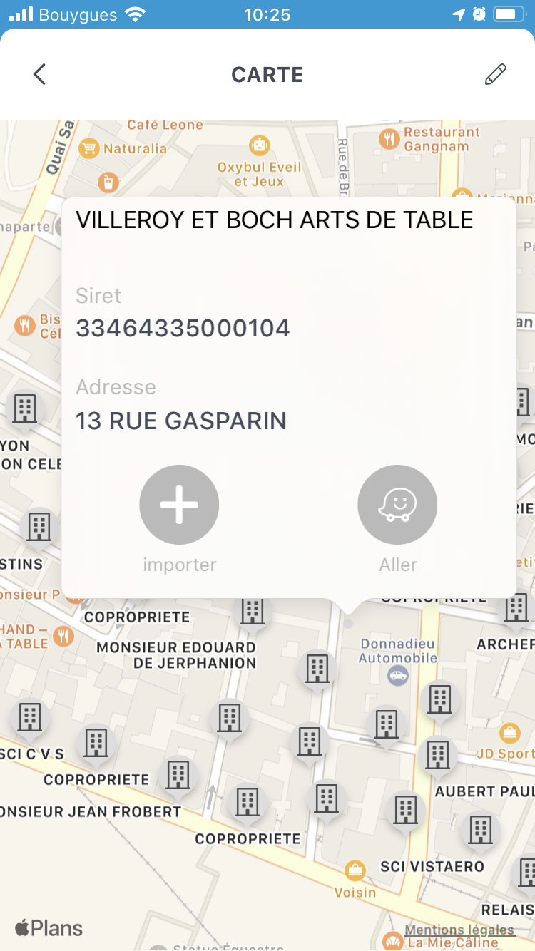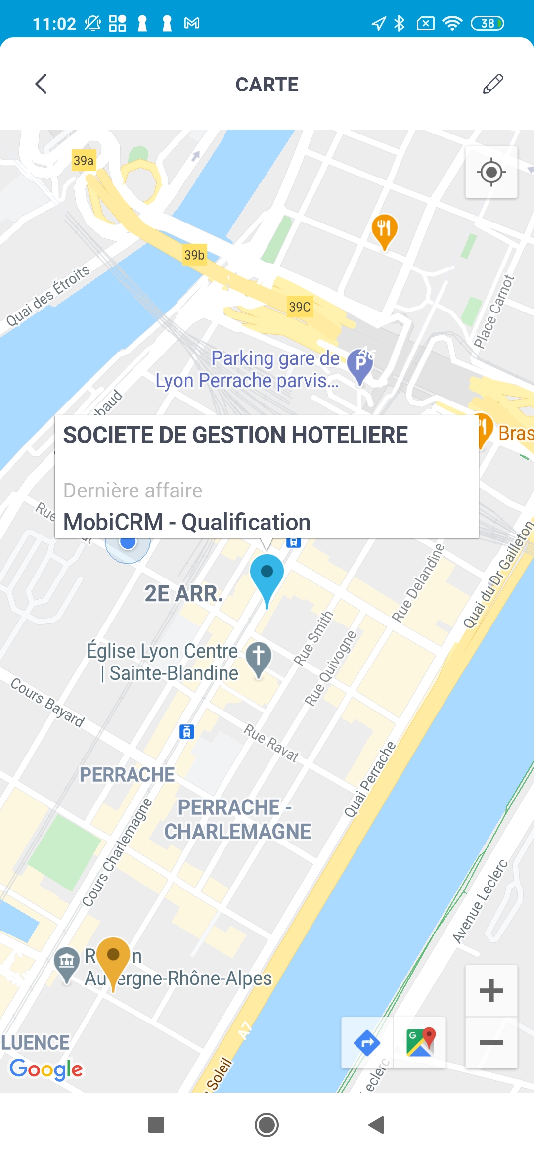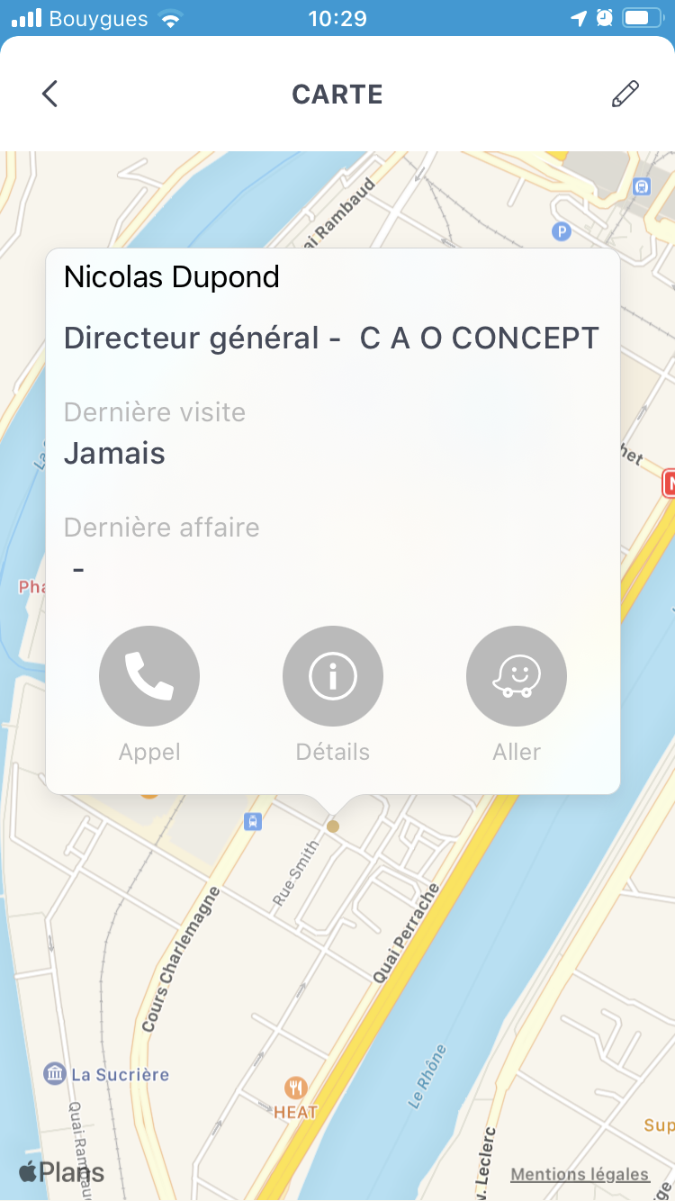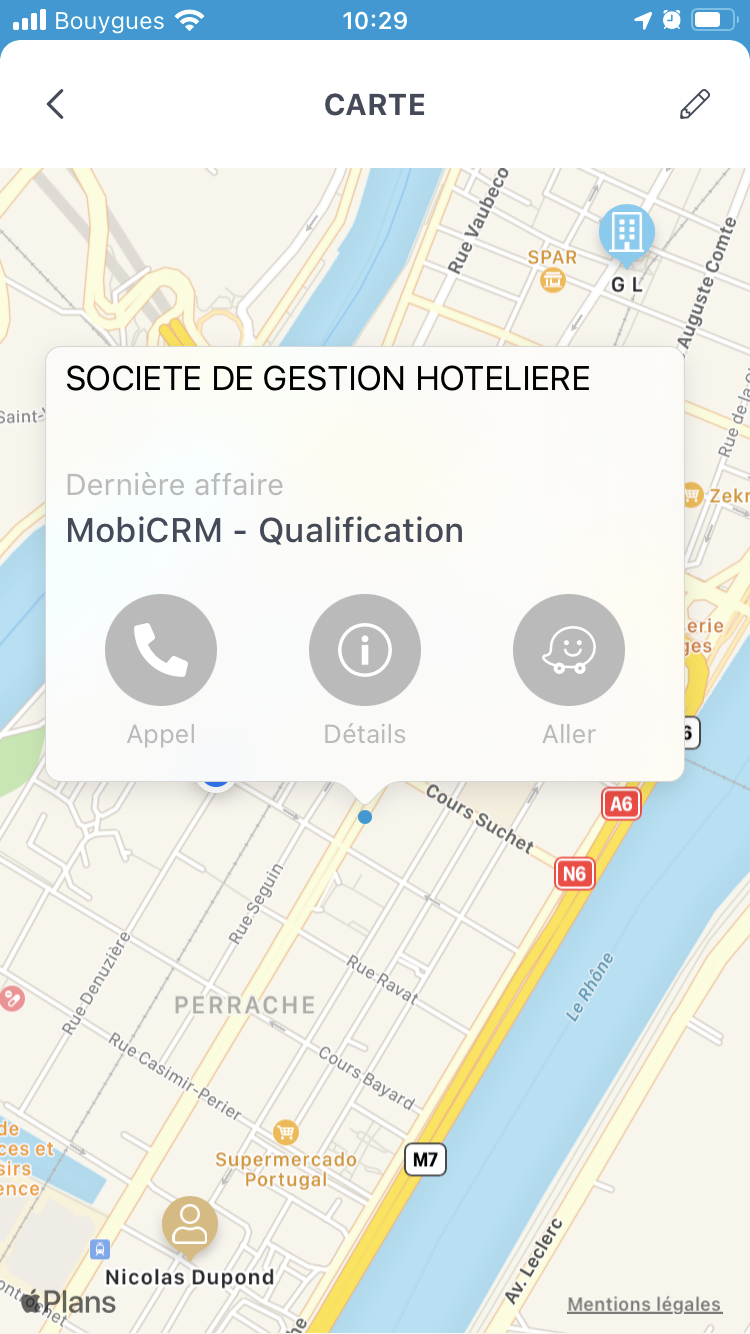 Des raccourcis permettent d'appeler le compte, d'afficher la fiche du compte ou de lancer la navigation avec Waze.