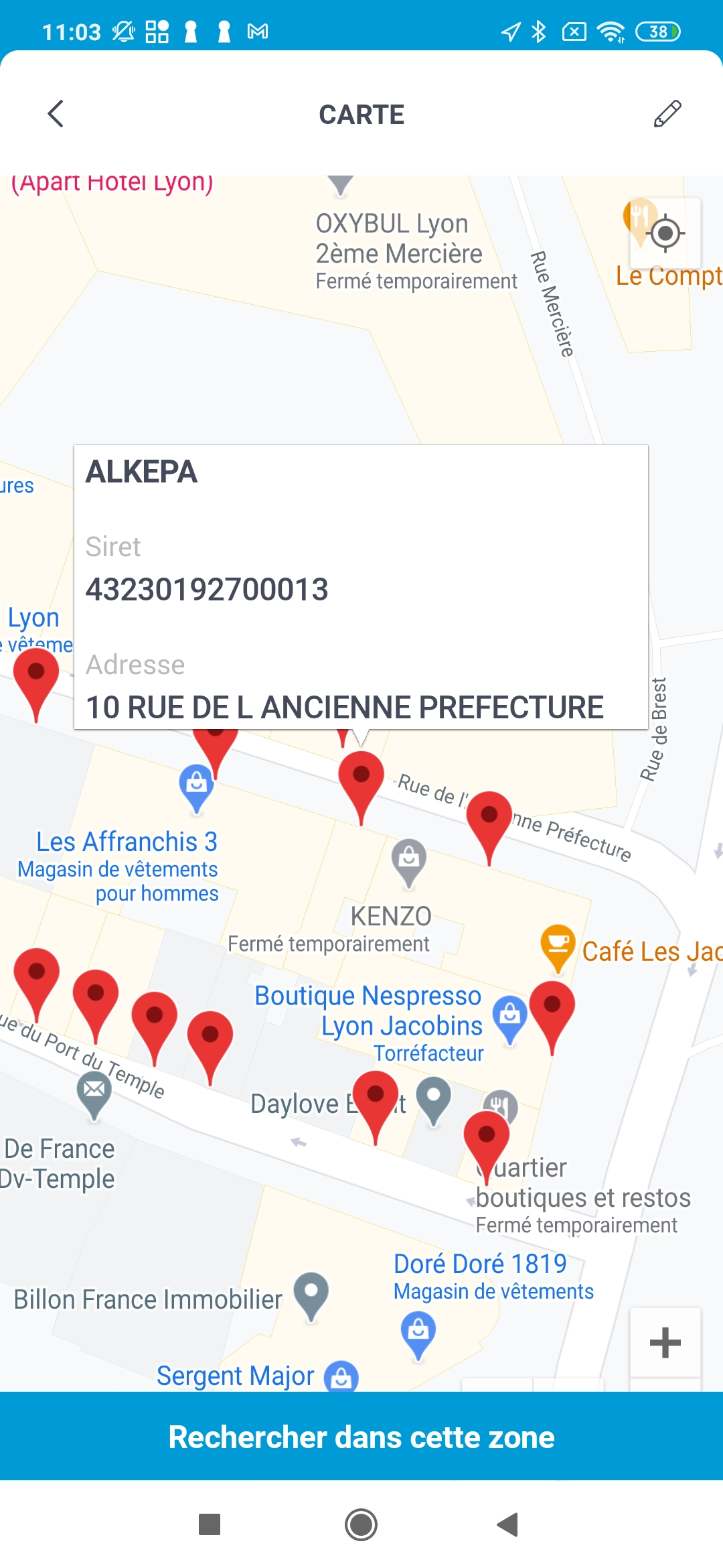 Lorsque l'option Entreprises est sélectionnée, la carte affiche des entreprises issues de la base SIRENE.