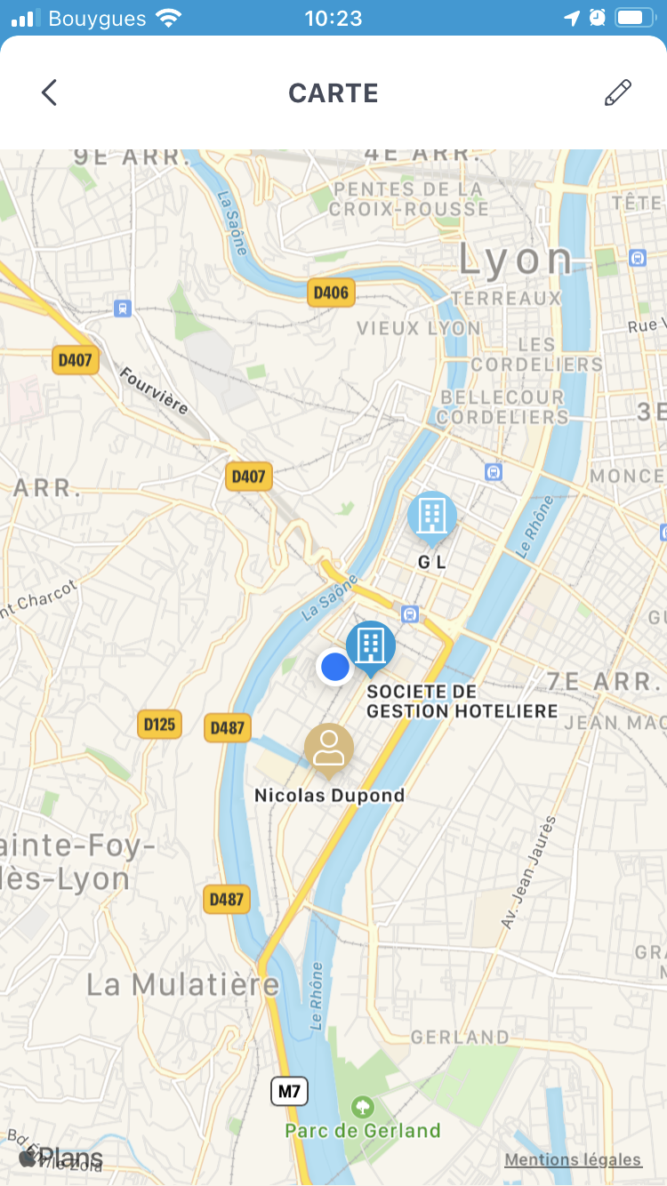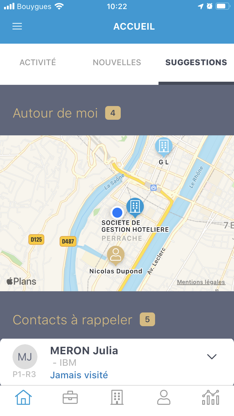La version mobile de MobiCRM propose dans l'onglet suggestions une carte affichant, les client, les prospects et les contacts dans les alentours.