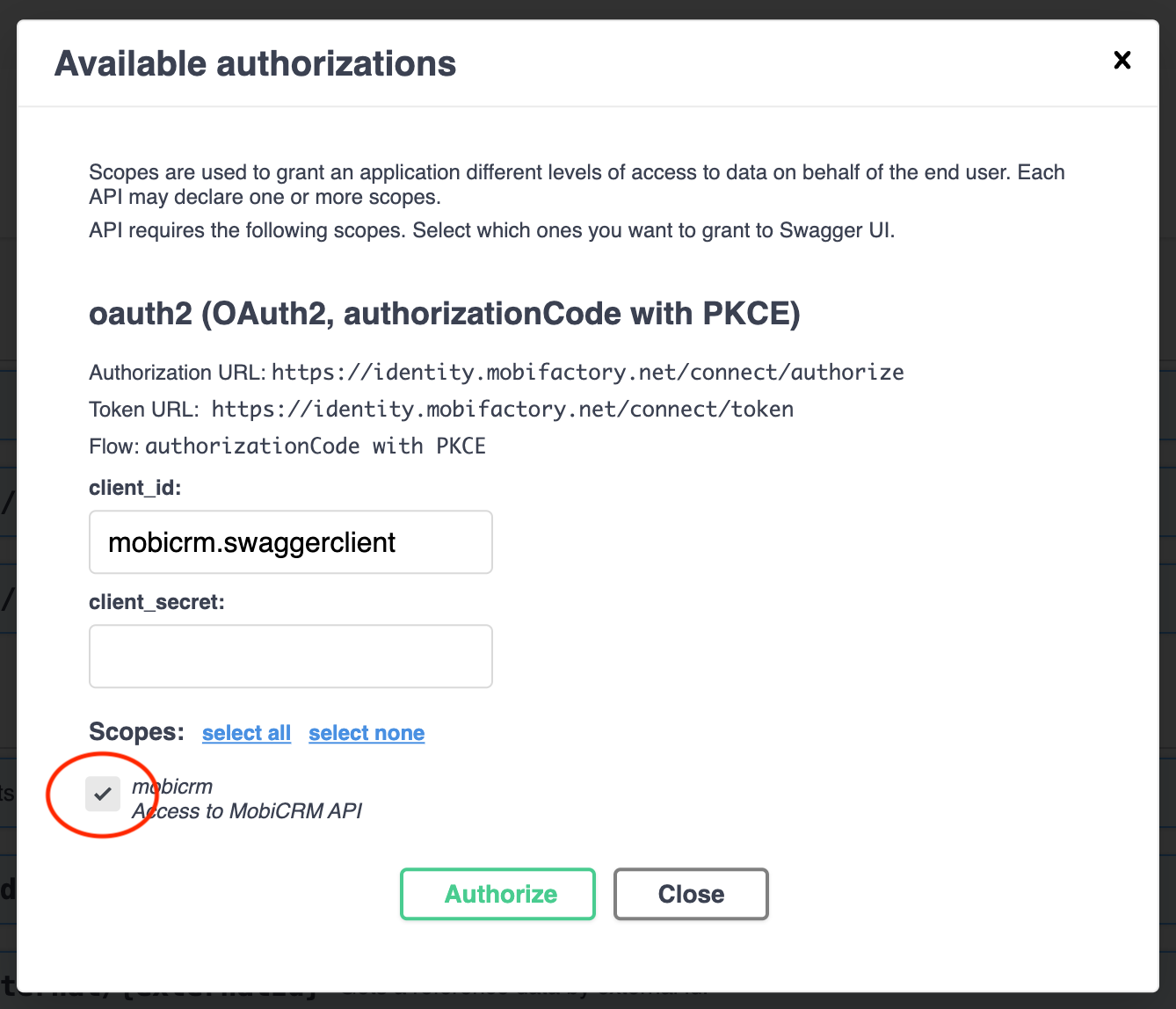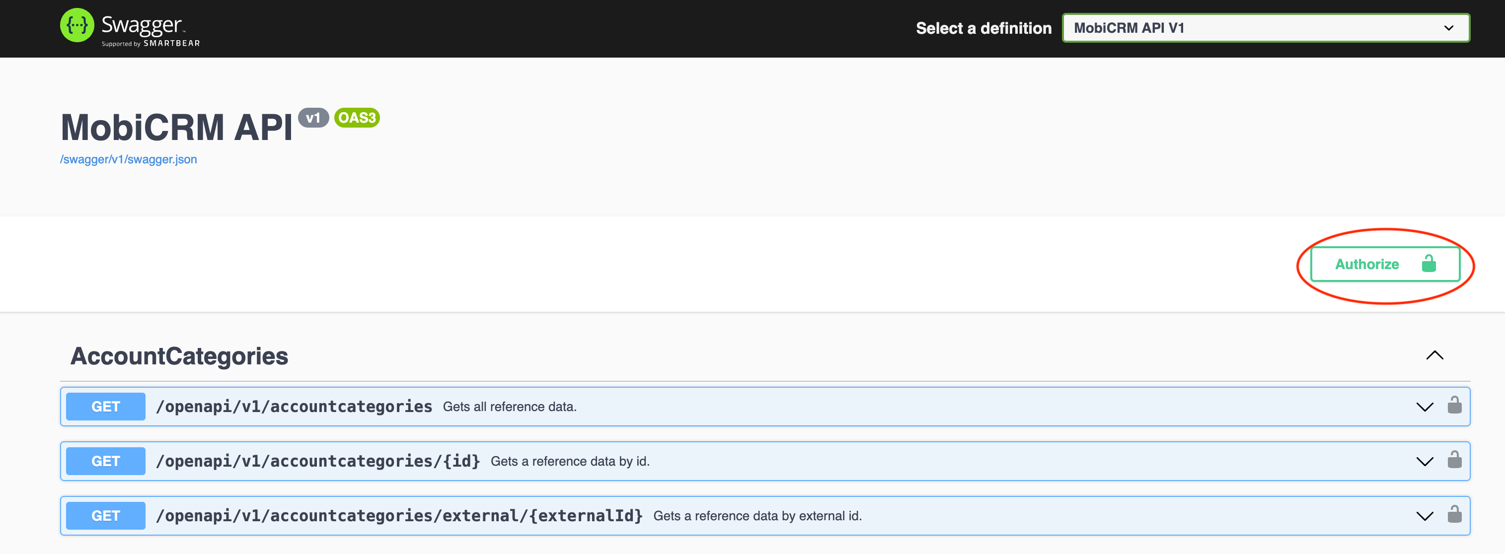 Vous pouvez maintenant tester l'API de MobiCRM en sélection le endpoint de votre choix.