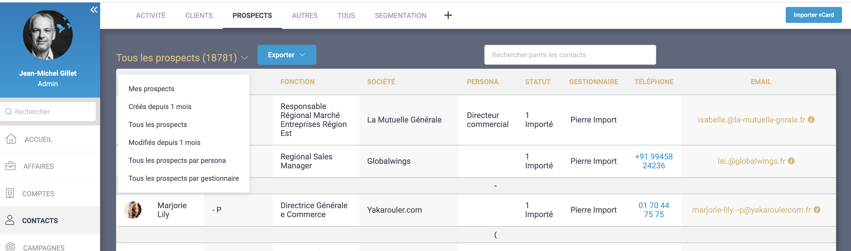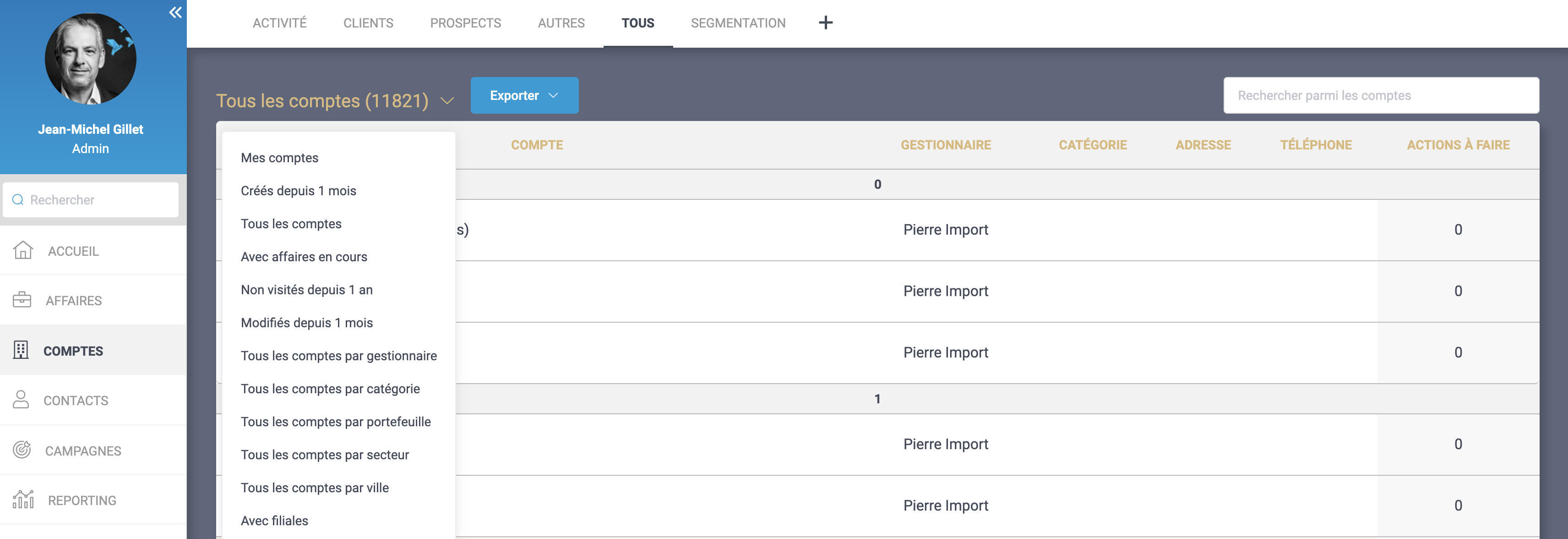 Comme pour les comptes, les contacts sont maintenant séparés en Client, Prospect, Autre, Tous.