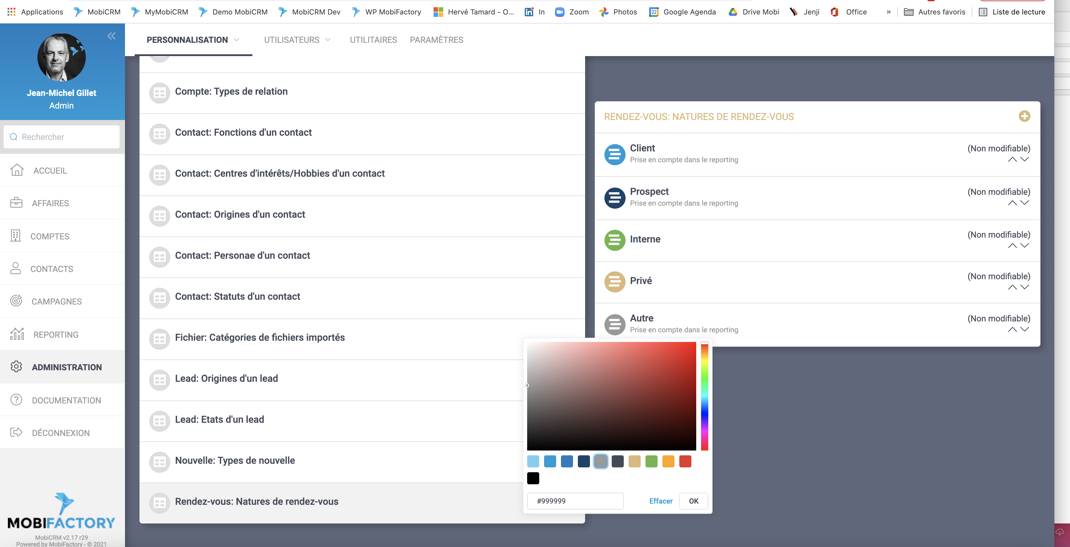 Pour ce faire, il suffit de cliquer sur la pastille de couleur dans le menu Administration/Personnalisation/Natures de rendez-vous.
