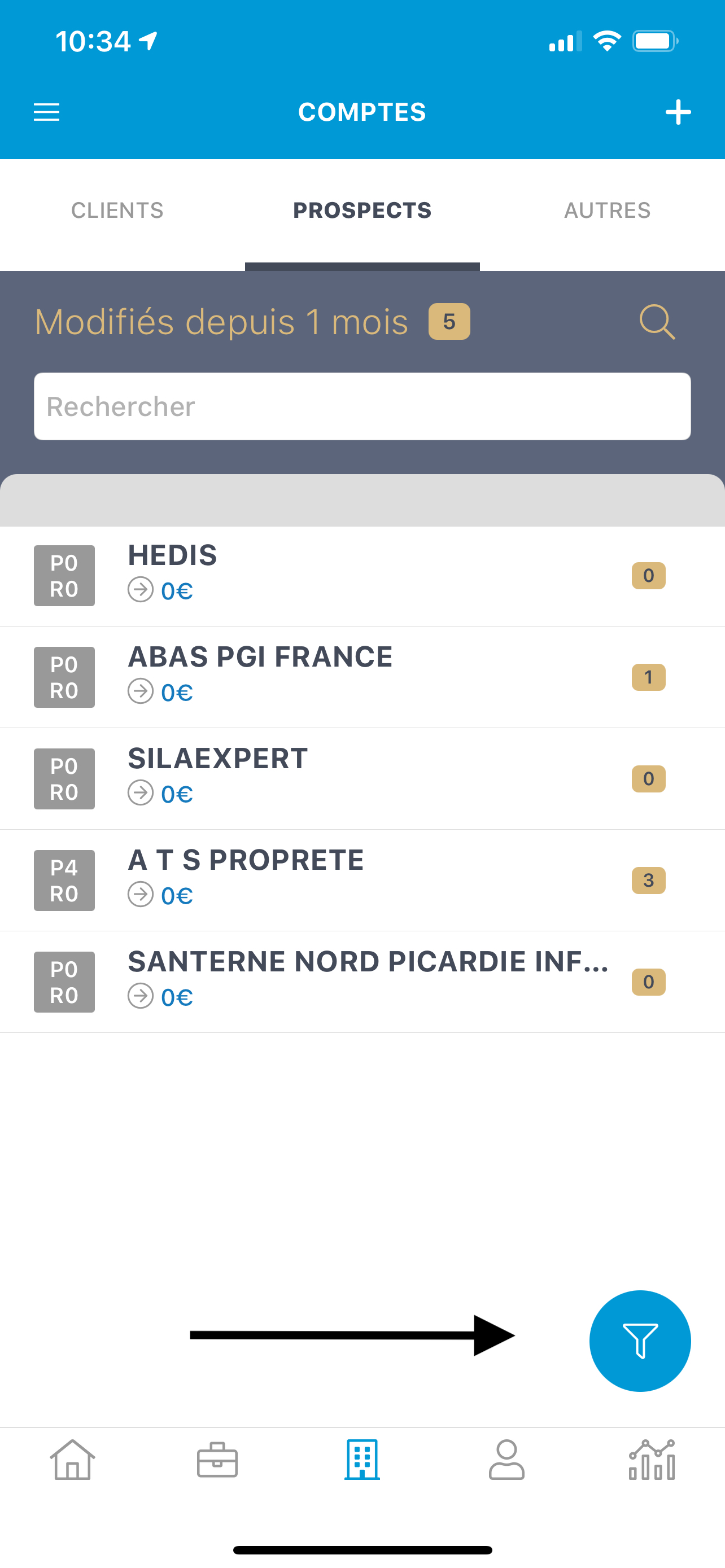 Désormais, vous pouvez rechercher directement un compte un contact une affaire grâce à la fonction de recherche intégrée dans les listes. Il suffit de cliquer sur la loupe.