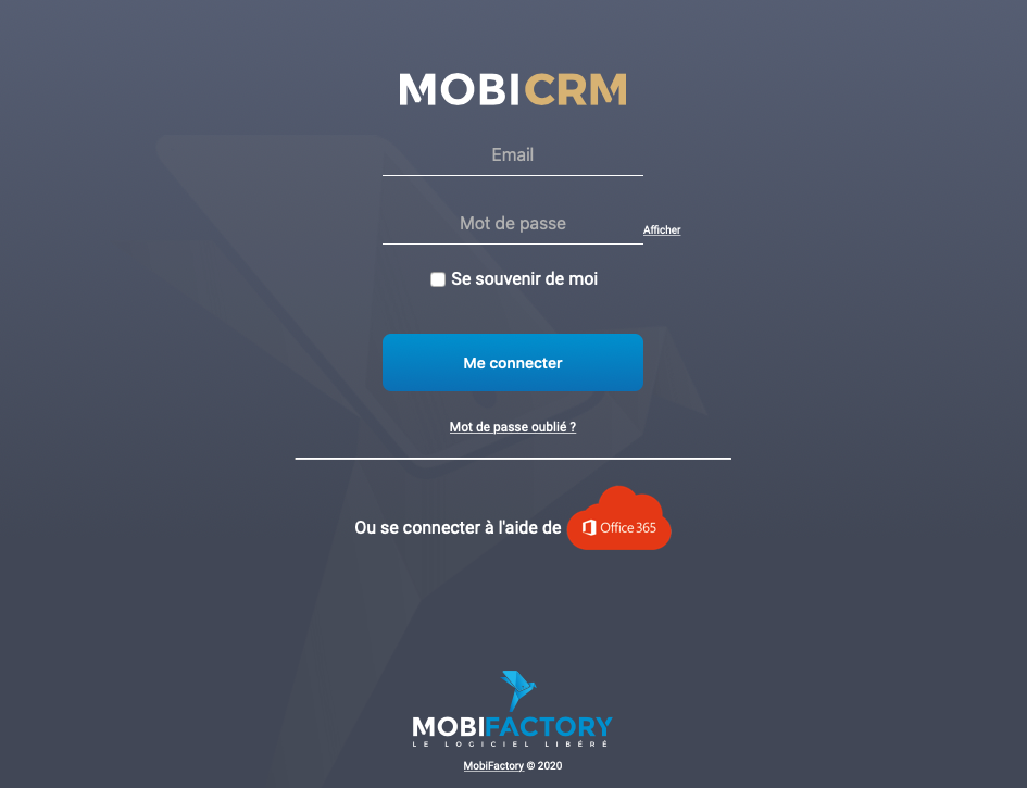 Pour cela, cliquer sur le logo "Office 365" sur la page de login de MobiCRM.