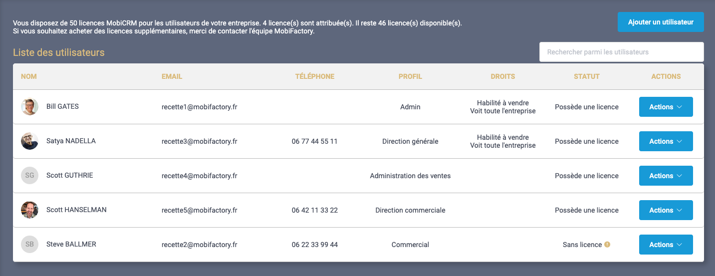 Contacter MobiFactory si vous souhaitez modifier le nombre d'utilisateurs de votre licence.