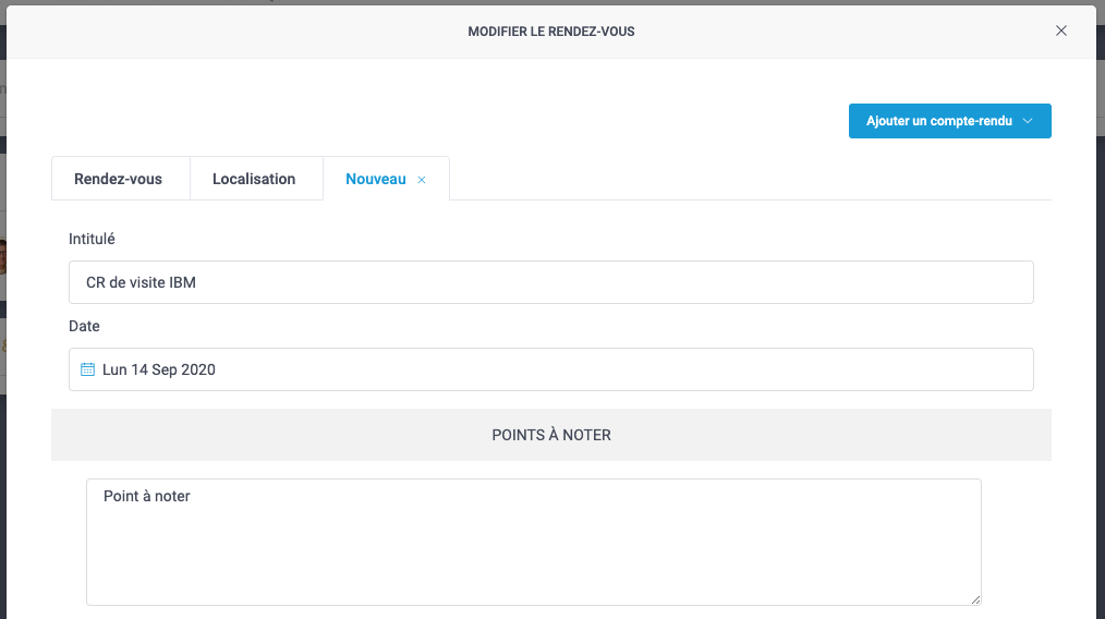Un système d'onglets permet d'accéder aux différentes parties du rendez-vous, dont ses comptes-rendus associés.