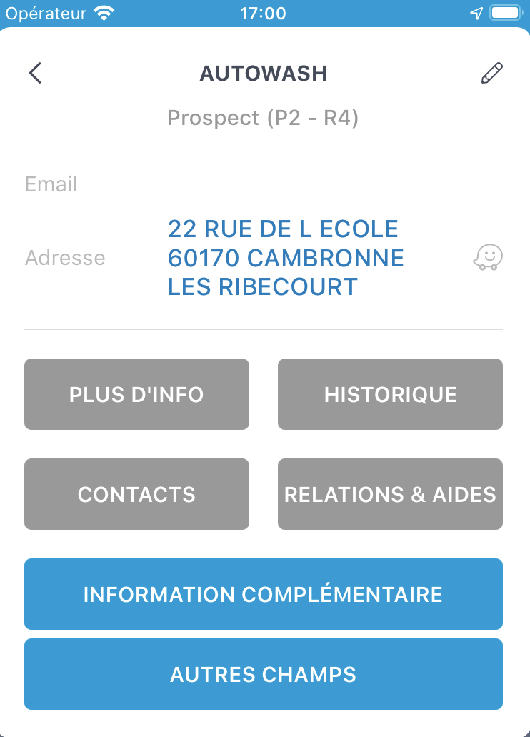 Sur le Mobile, chaque page personnalisée est accessible depuis un bouton spécifique sur la fiche Compte / Contact / Affaire.