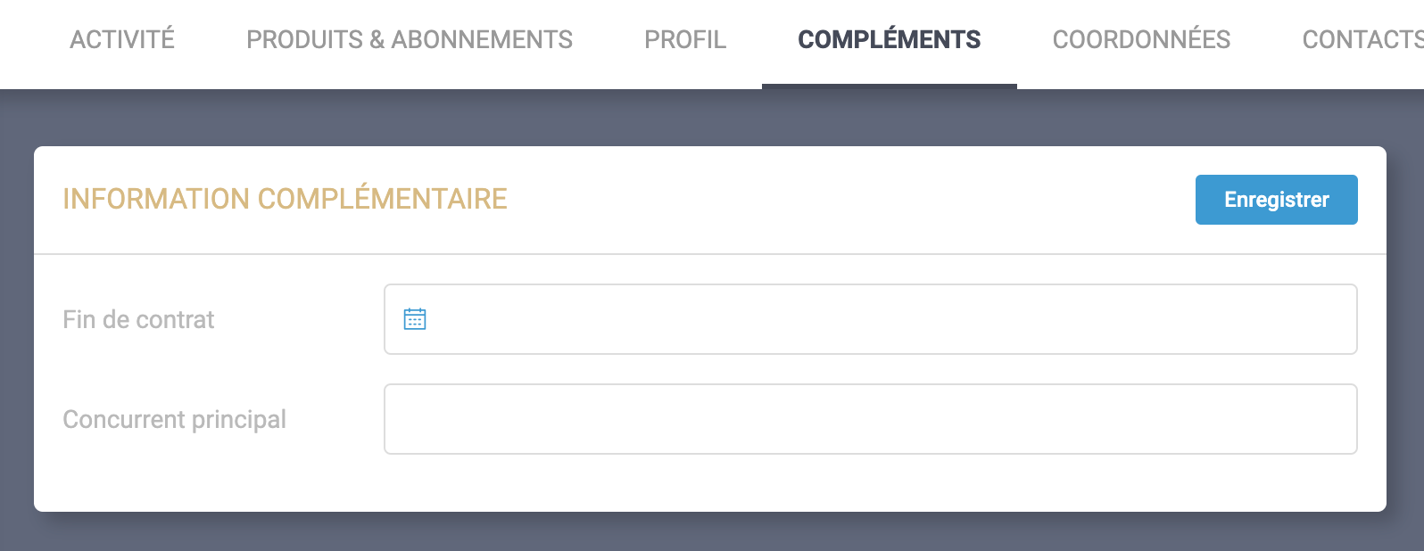 Sur la fiche Compte, Contact, ou Affaire, les champs personnalisés peuvent être regroupés au sein d'une page dédiée, appelée "page personnalisée".