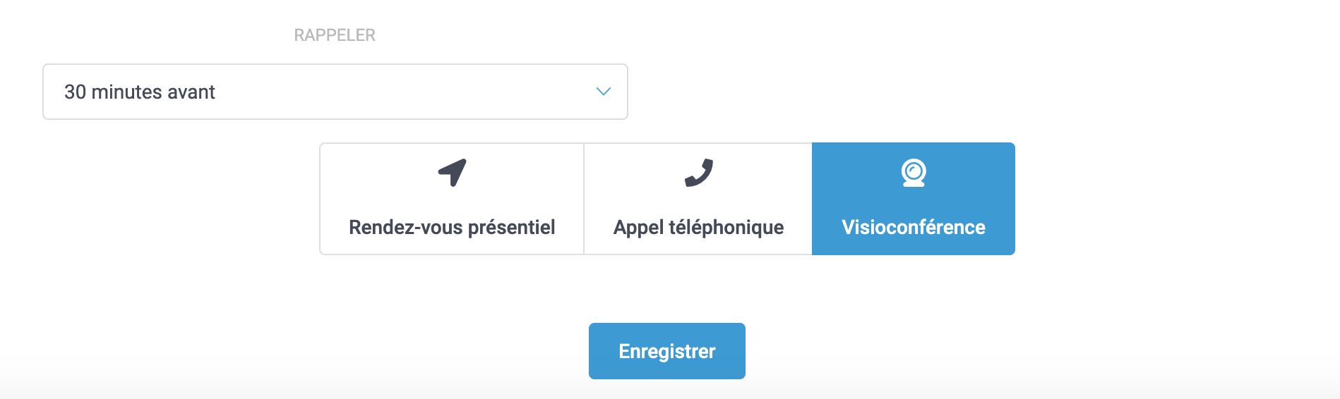 En plus des rendez-vous présentiel et téléphonique, le type de rendez-vous "Videoconférence' est disponible.