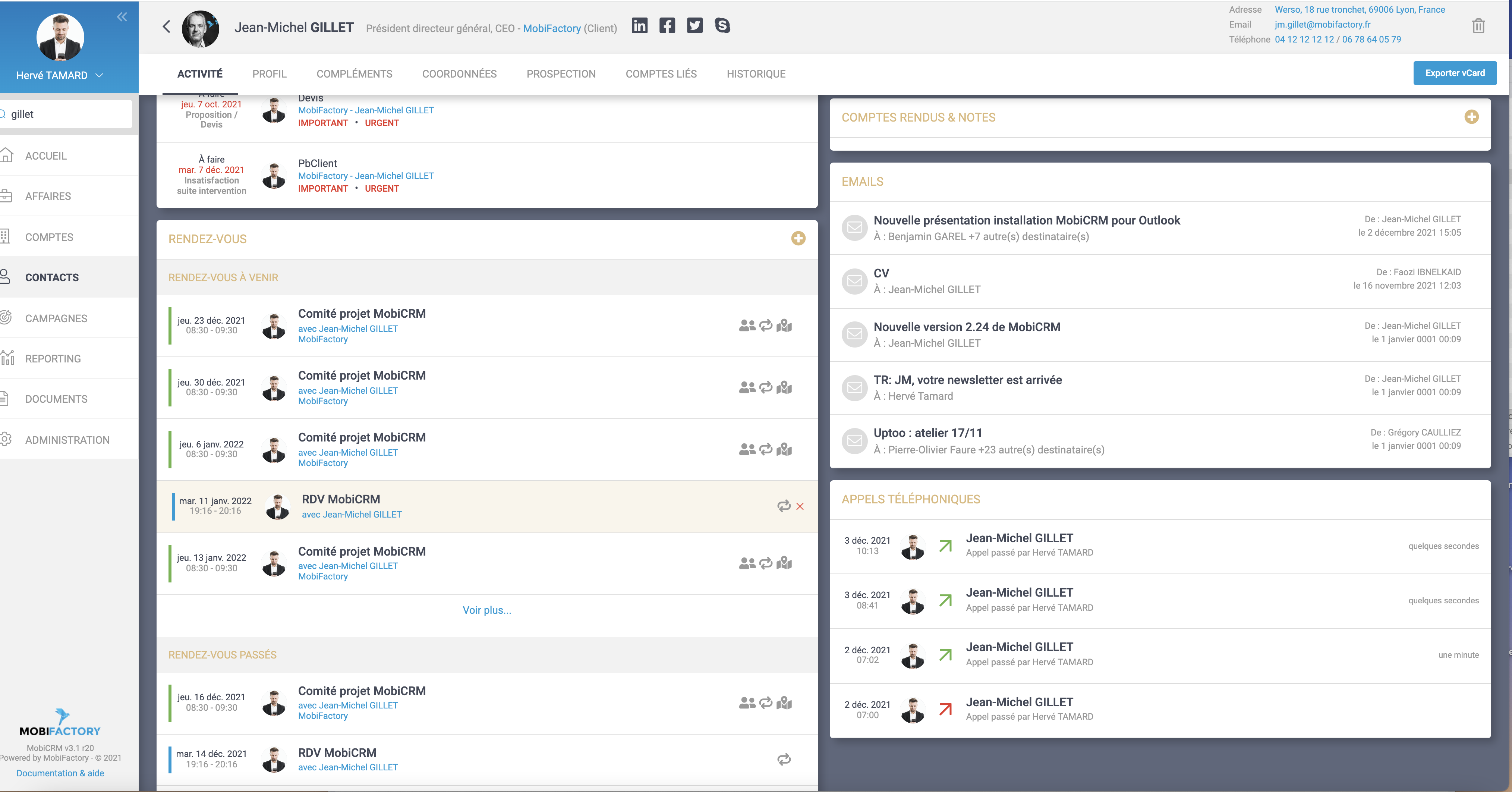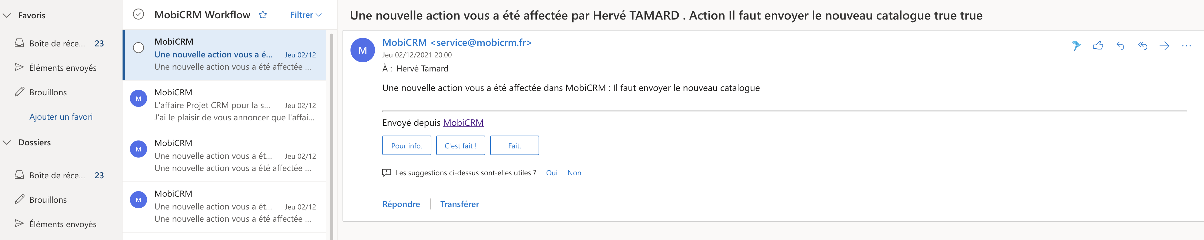 Les notifications Mails apparaissent dans votre messagerie, avec comme émetteur service@mobicrm.fr. Pensez à vérifier dans vos spams les premières fois.