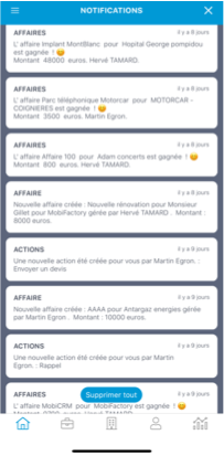Les notifications Push apparaissent à la fois dans MobiCRM, sur le smartphone et sur le web, mais également dans votre centre de notification classique sur votre smartphone, ou sur votre montre connectée.