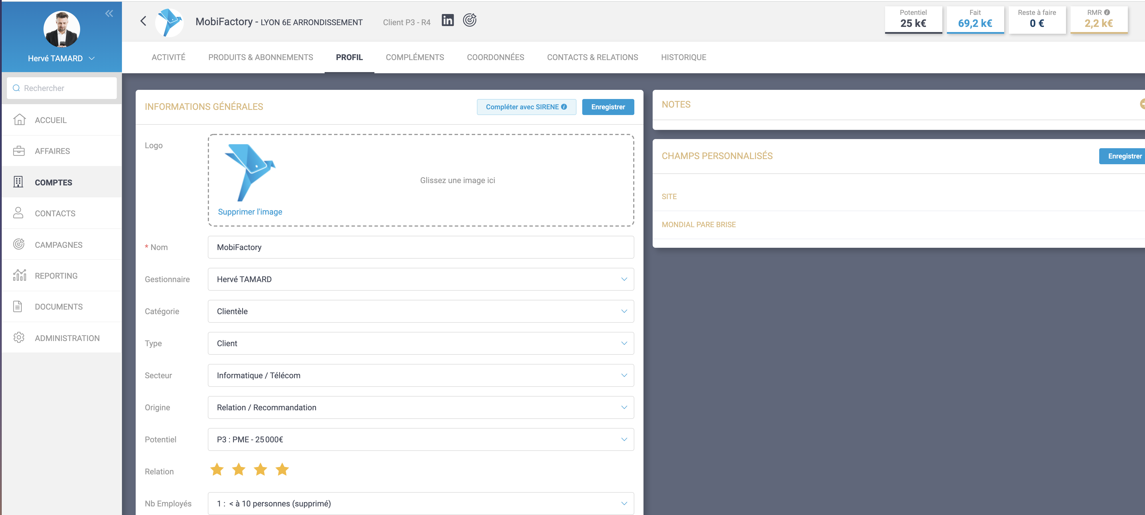 Sur les comptes existants, vous pouvez dorénavant mettre à jour automatiquement les fiches, notamment le siret, le siren, l’ape, les effectifs, l’adresse du siège avec les données de l’Insee. Le bouton « Compléter avec SIRENE » vous permet de faire cela.