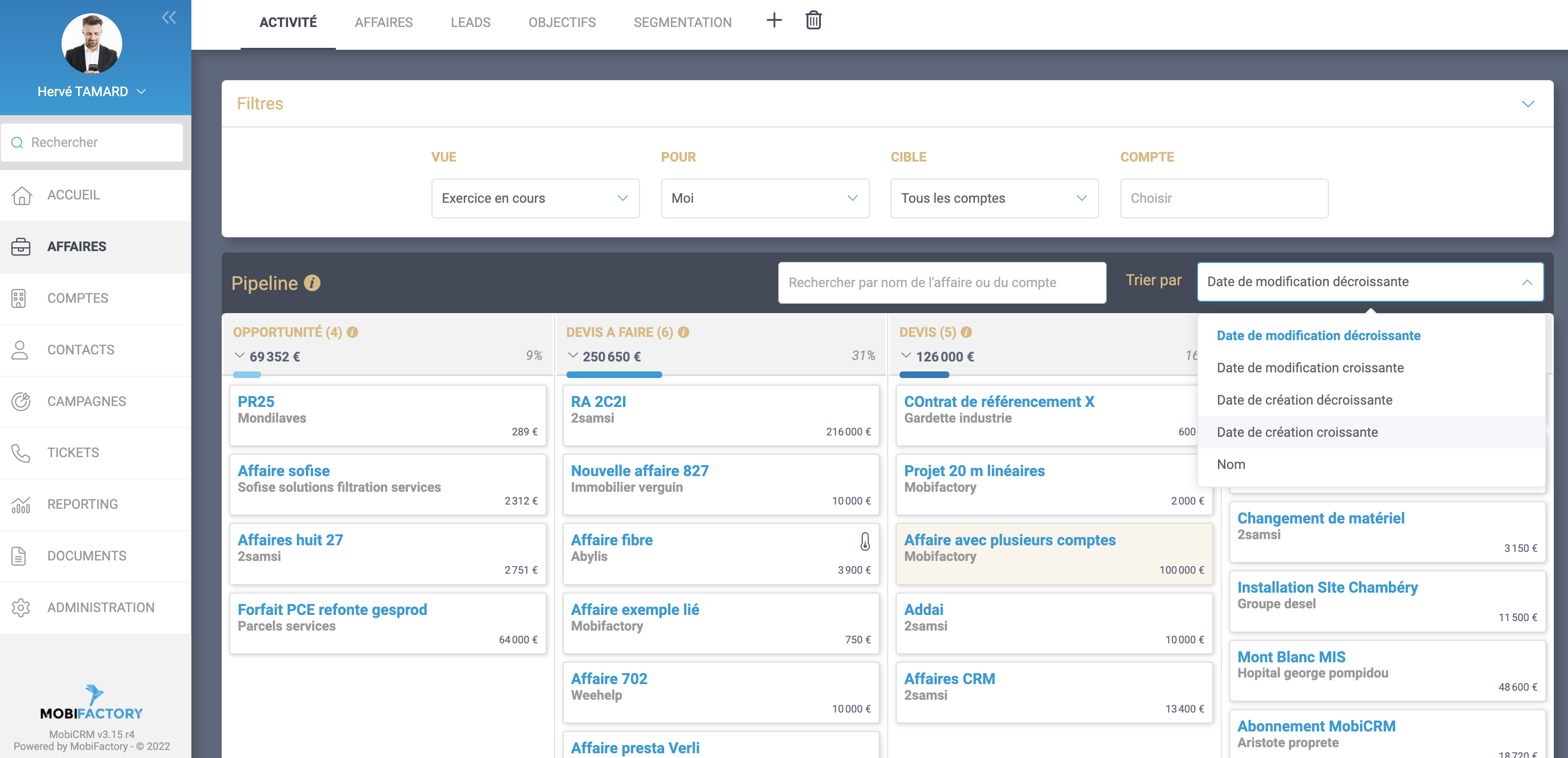 De nouveaux critères de tri ont été intégrés dans le Kanban des affaires.
