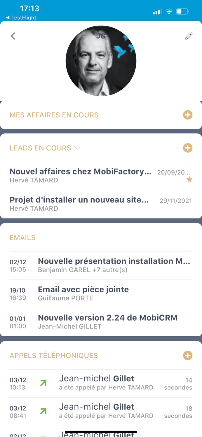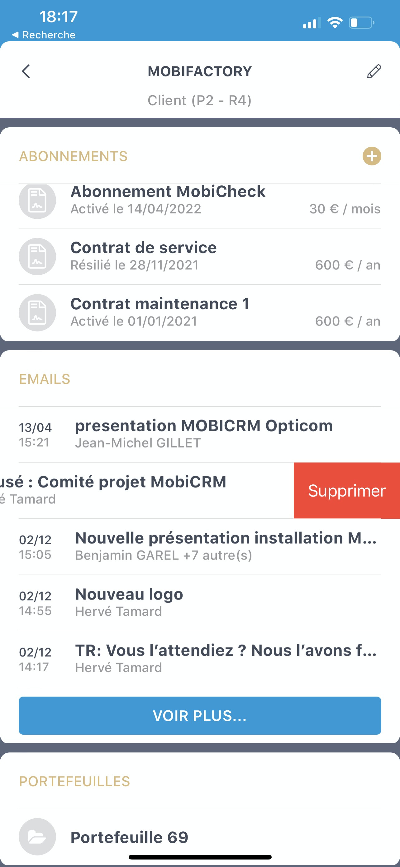 Dans le 360 Compte et Contact, vous avez maintenant accès aux leads (en cours, tous, à traiter…) et aux emails, avec les pièces jointes des emails. Vous pouvez supprimer les emails inutiles (uniquement dans MobiCRM) par simple slider.