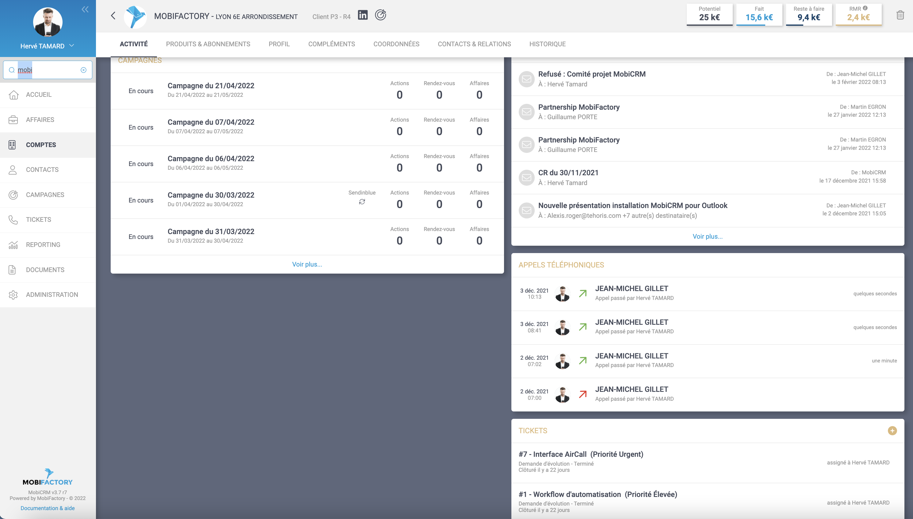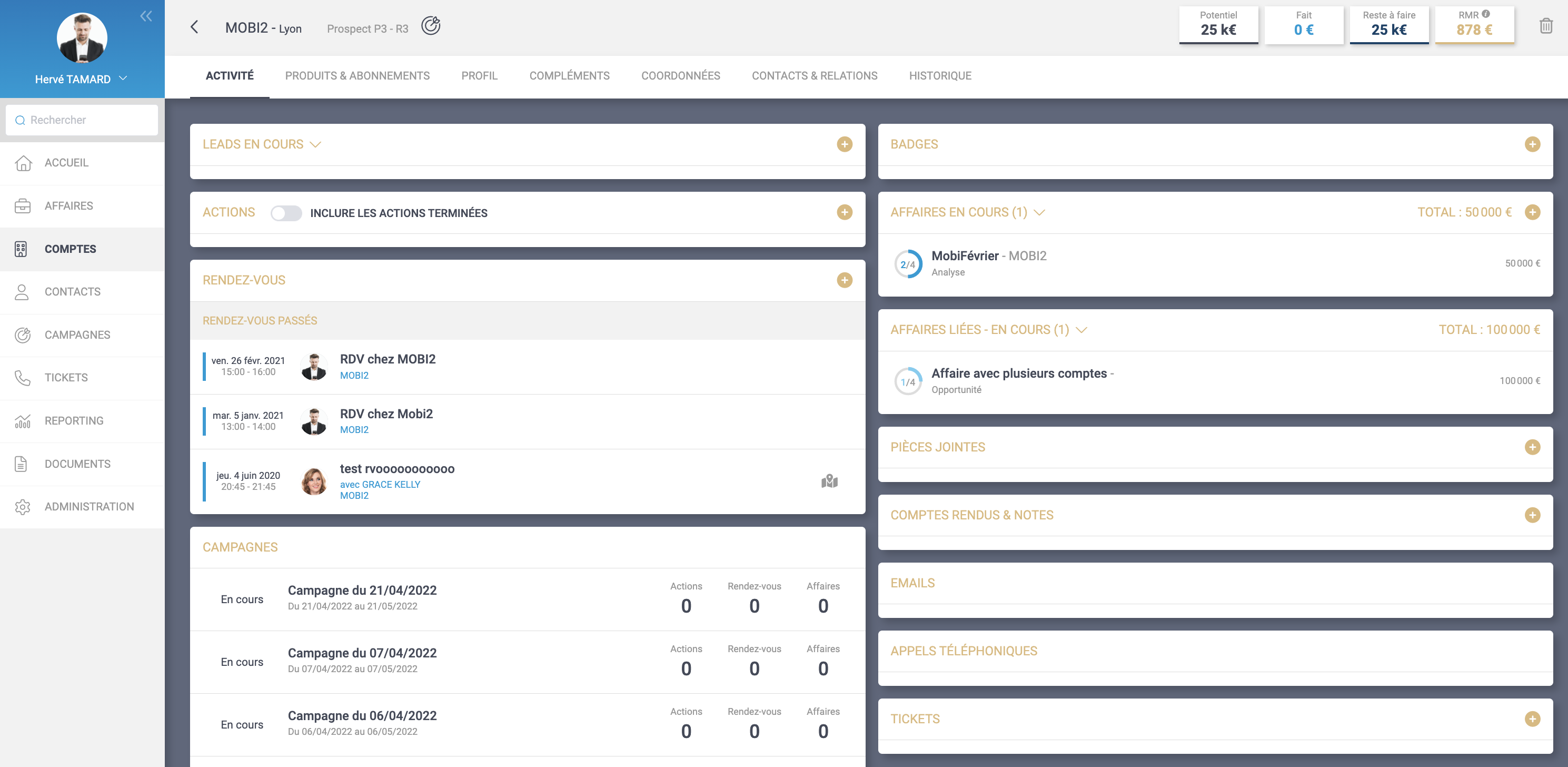 De même, en cliquant sur le compte ou le contact, vous arrivez directement à sa fiche dans MobiCRM