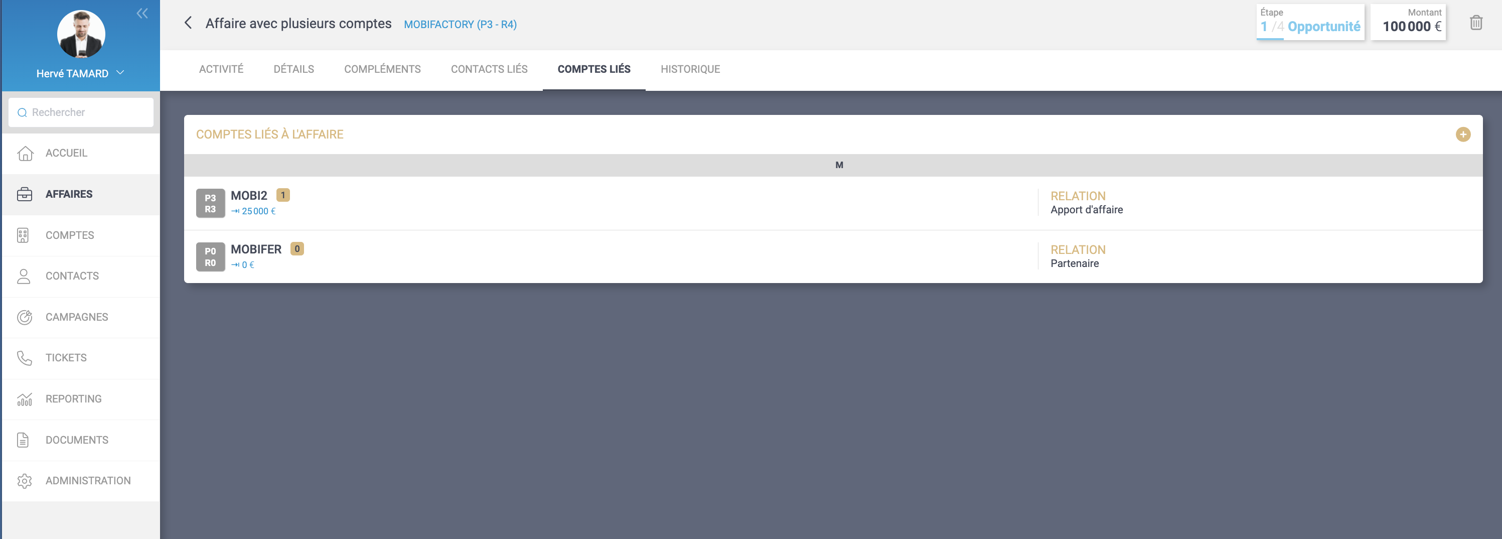 De nouvelles fonctions apparaissent dans les affaires : la gestion des comptes et des contacts liés. Ceci permet de gérer le cas ou d‘autres comptes (des partenaires, des filiales…) d’autre contacts , participent à une affaire, afin d’enrichir la vue 360 d’une affaire. Un nouvel onglet « compte lié » apparait dans la fiche affaire, vous permettant de rajouter tous les partenaires, fournisseurs, filiales, financeurs … qui participent à l’affaire.