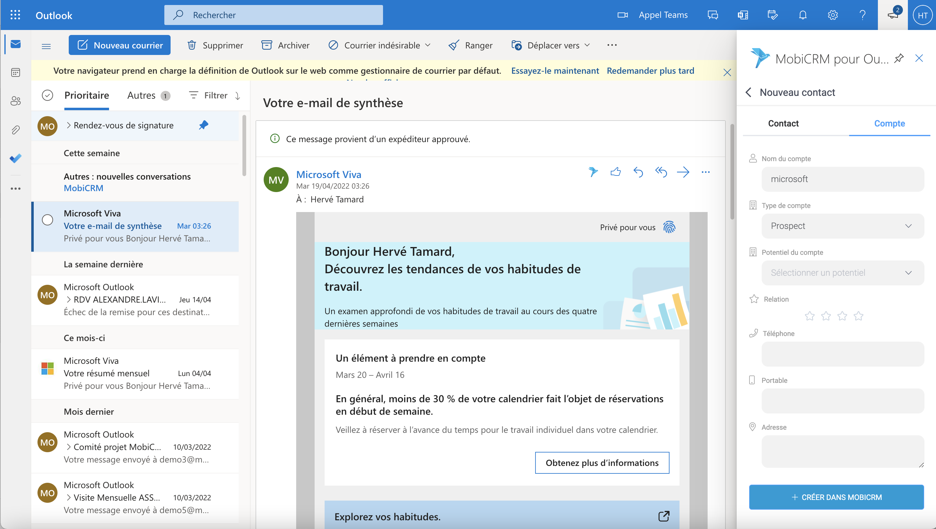 Addin Outlook : création directe des comptes. Navigation dans MobiCRM