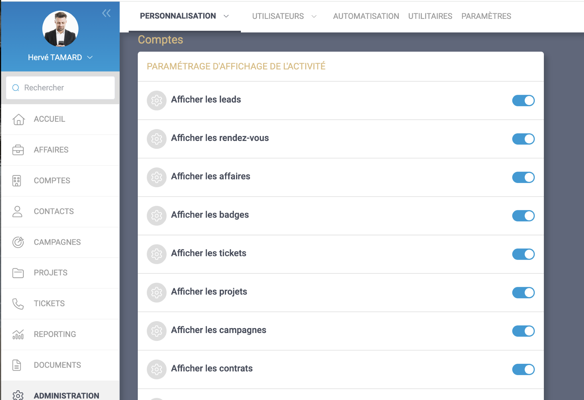 L’affichage des contrats n’est pas activé par défaut. Pour l’activer, dans Administration/Personnalisation/Comptes, cocher la case « Afficher les contrats ».