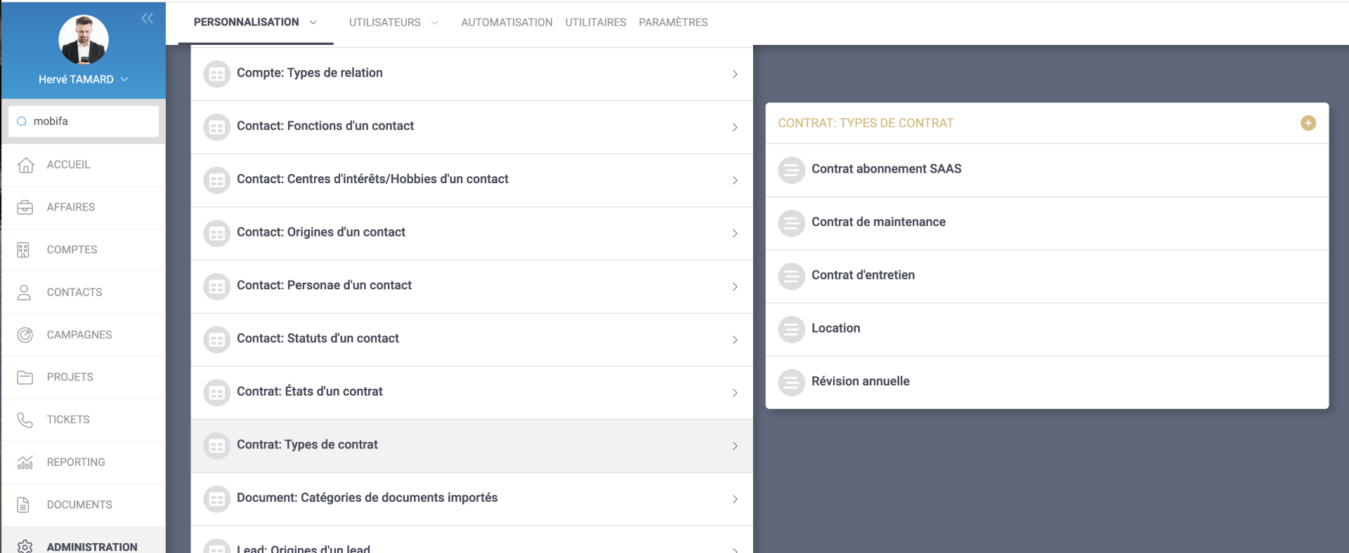 Vous pouvez personnaliser les types de contrats et les états du contrat dans le référentiel (Administration/Personnalisation/Référentiel).