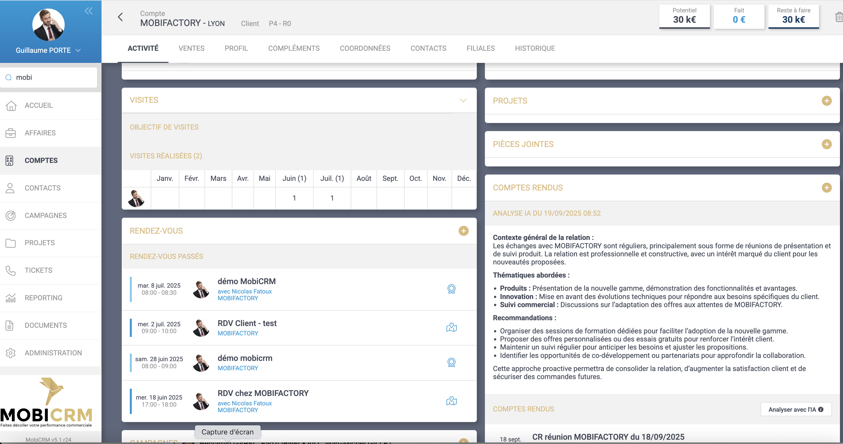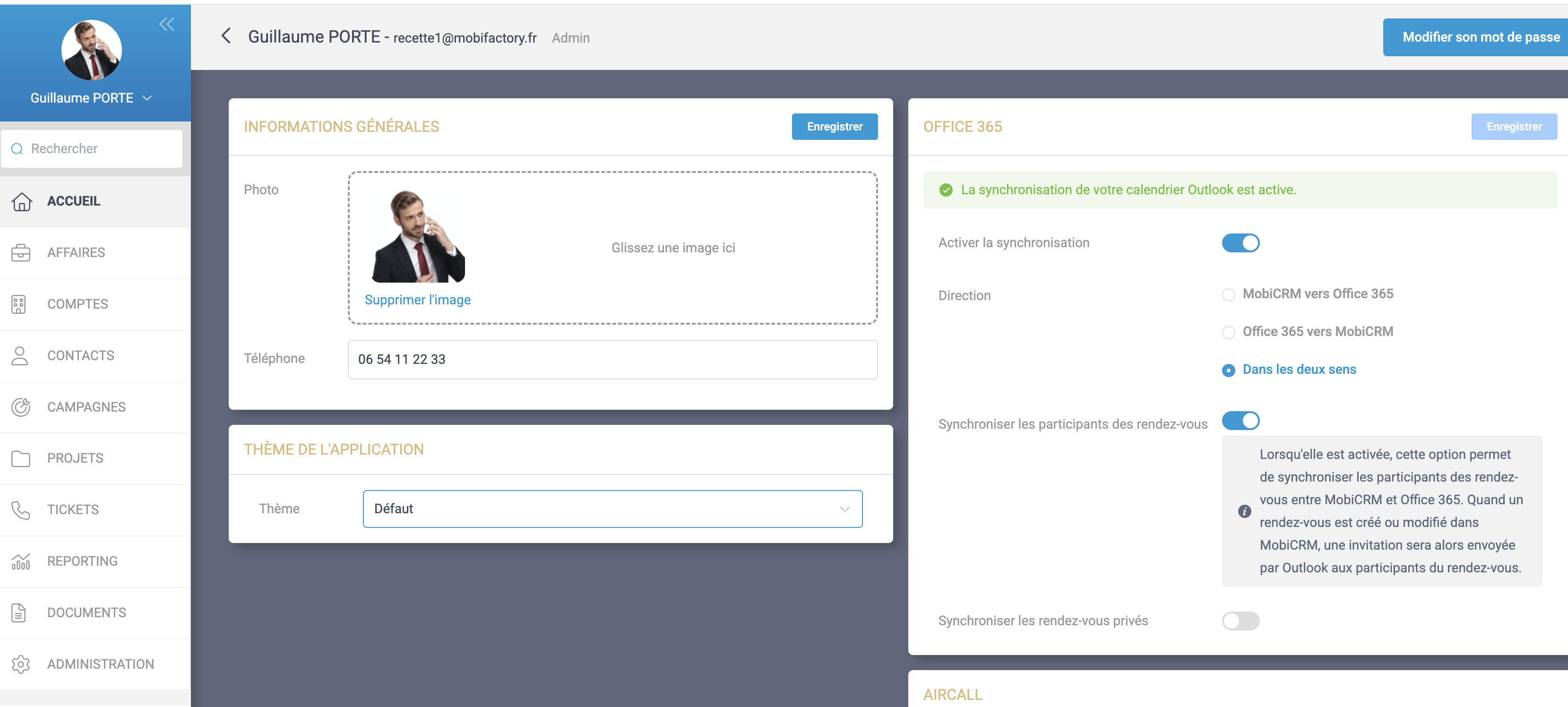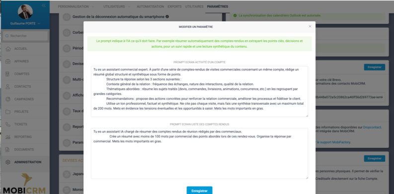 - L’administrateur MobiCRM peut modifier les prompts IA dans le menu Paramètre