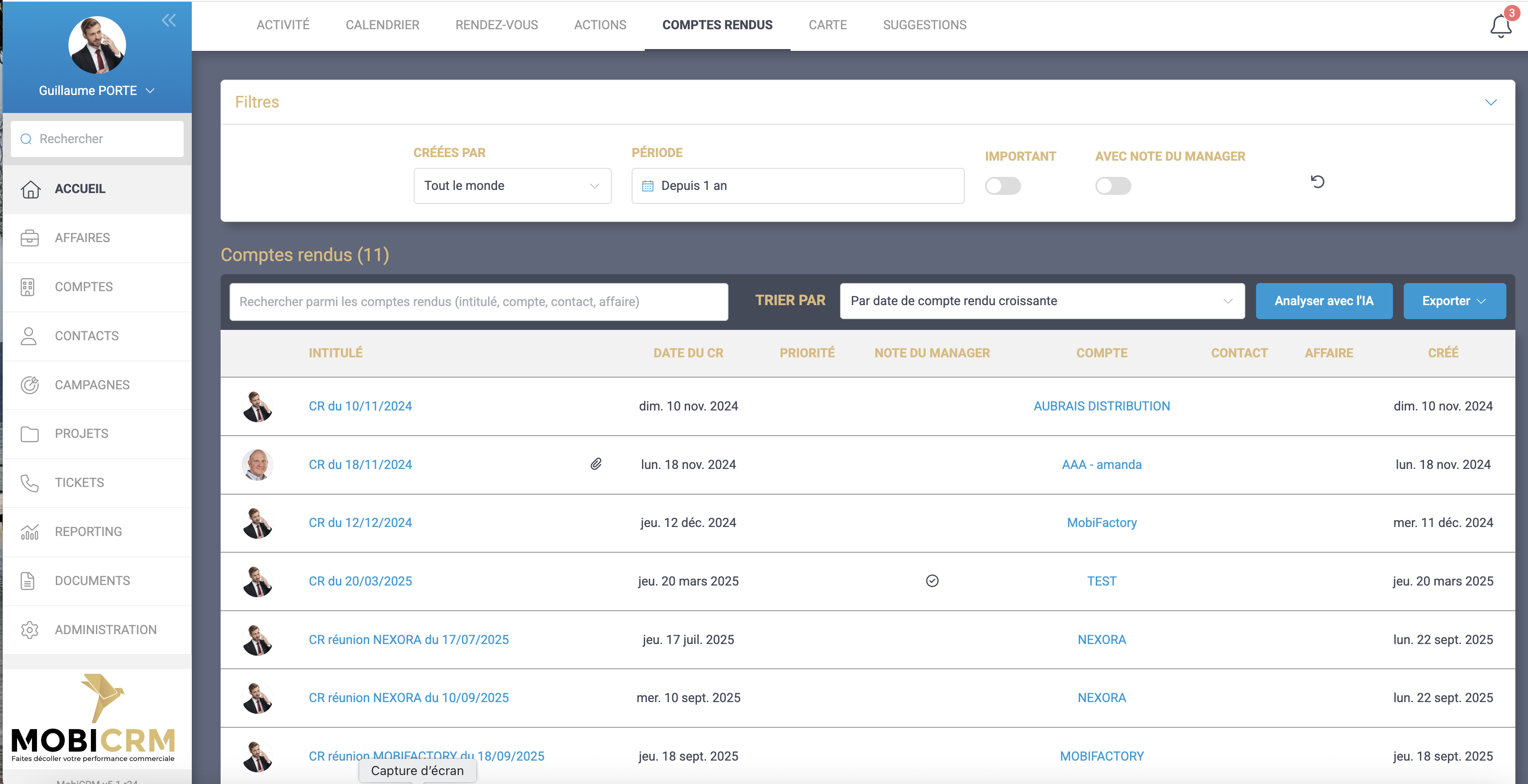 - Dans le 360 client apparait un bouton Analyser avec l’IA. Ceci va déclencher l’analyse de l’IA sur tous les CR présents, en fonction d’un modèle (le prompt) paramétrable par vos soins.