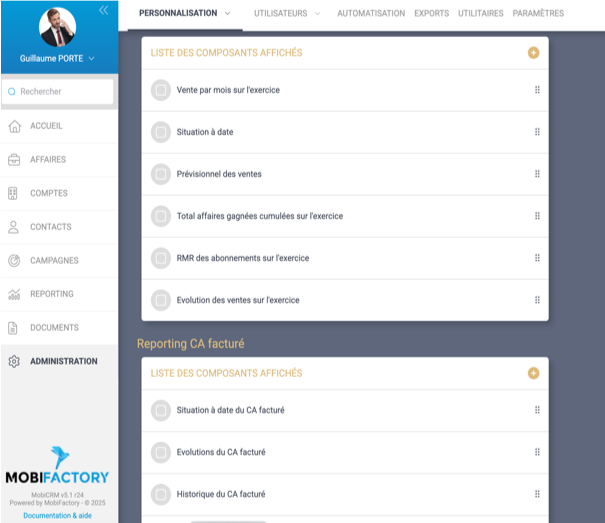 - Vous pouvez dorénavant personnaliser le reporting : choix des blocs à afficher, ordre d’affichage…