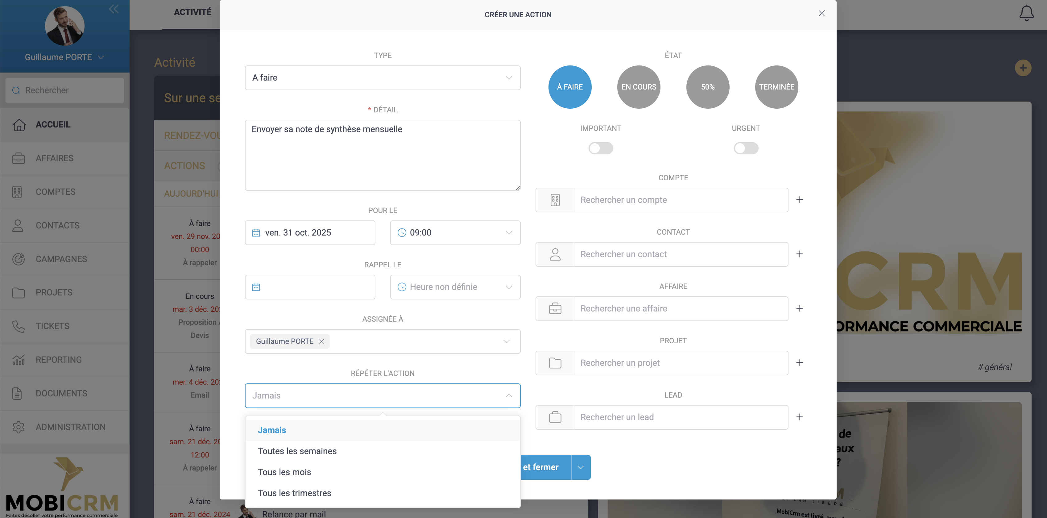 - Vous pouvez désormais mettre une périodicité à une action afin qu’elle se répète toutes les semaines, tous les mois…