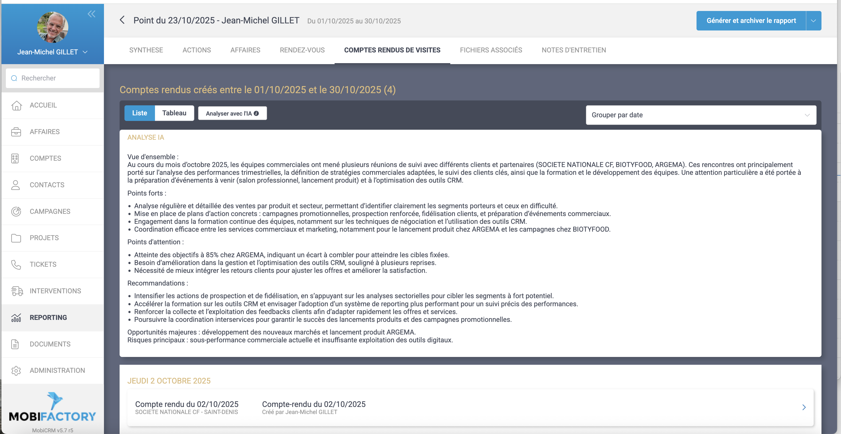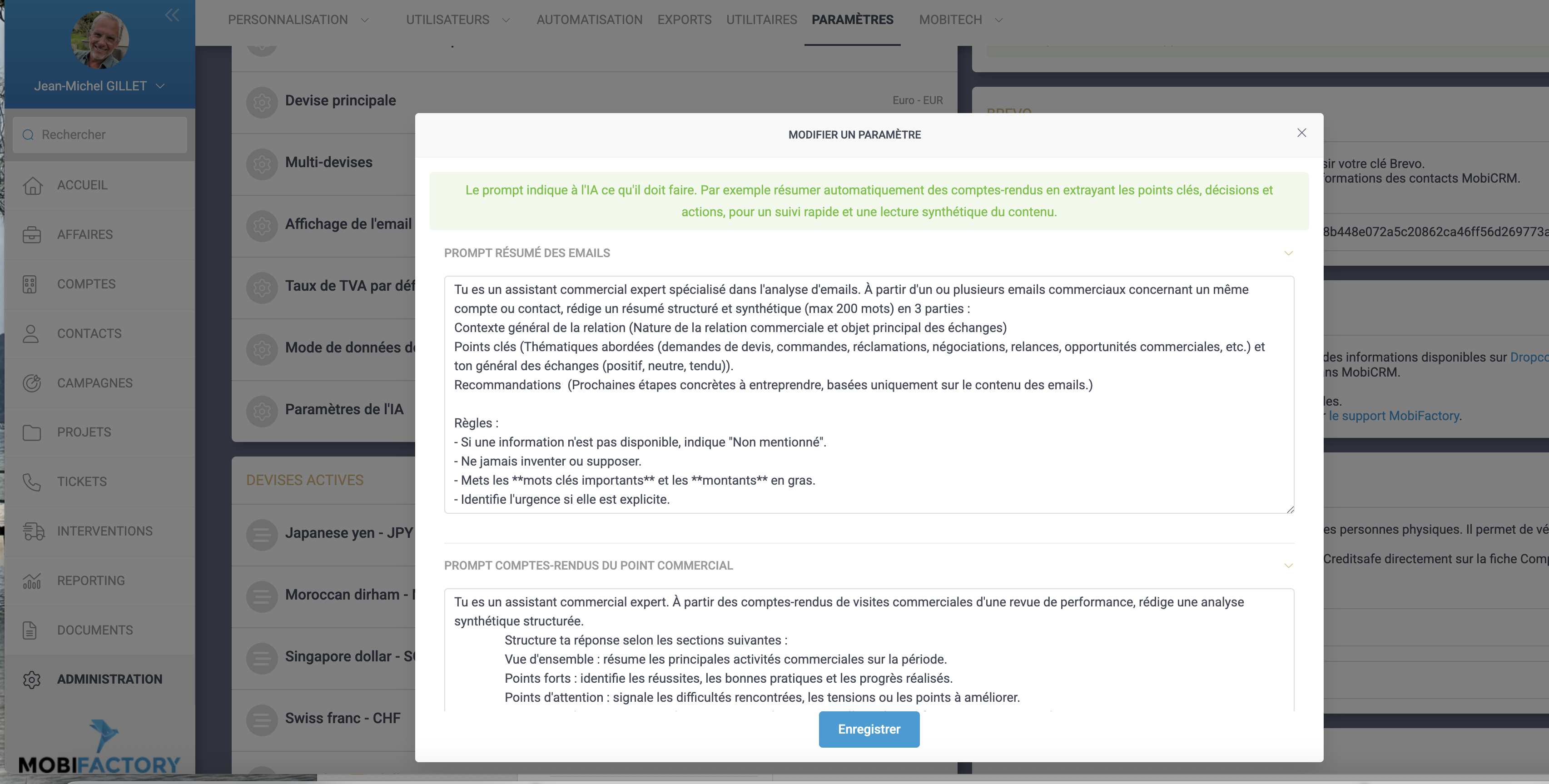 Ajout de l’IA dans les points commerciaux, avec possibilité de modifier le prompt dans l’administration. La synthèse IA est intégrée dans le rapport PDF.